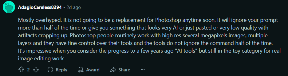 However, it cannot fully replace Adobe Photoshop or other professional image editing software due to limitations like quality degradation and inconsistency after multi-turn editing.