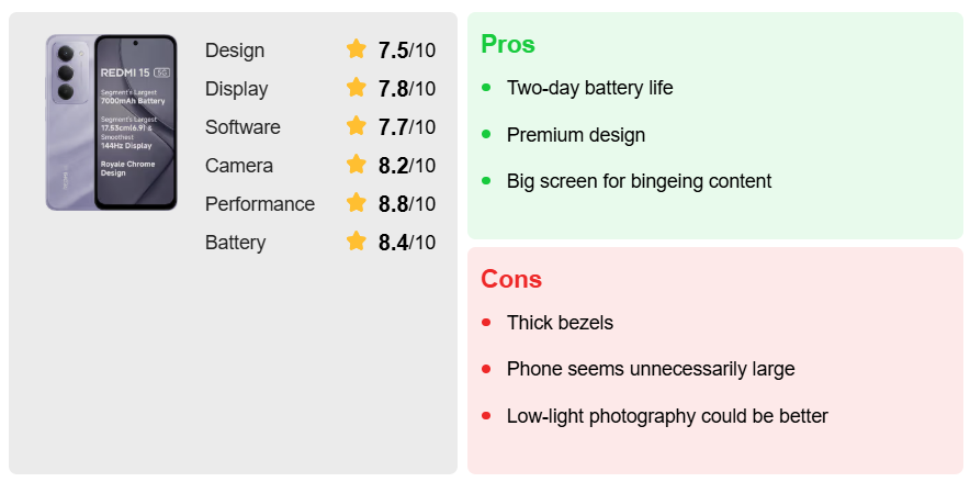 Even with the extra tasks, the phone easily lasts a full day. For anyone choosing the Redmi 15 as a primary or even travel backup phone, the extra charging oomph means you’ll stay powered up for longer outside an outlet.